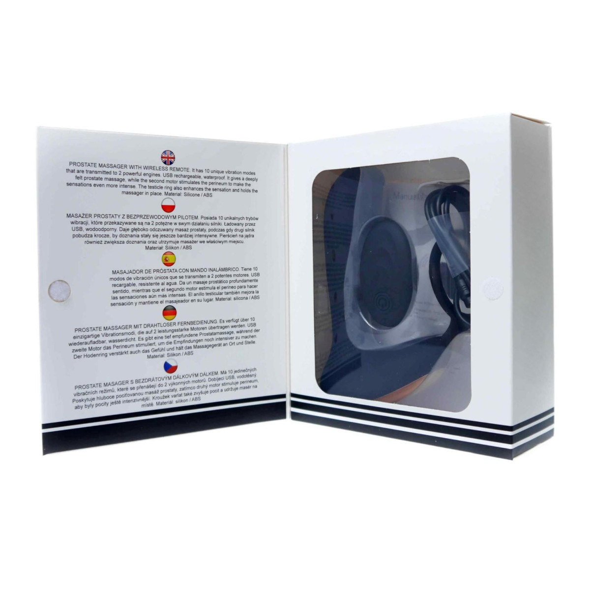 Masažer za prostatu sa prstenom za penis. Orgazam koji proizilazi iz stimulacije prostate je najveći i najintenzivniji, koji muškarac može da doživi. Ovaj stimulator sa daljinskim upravljanjem će vam nesumnjivo pomoći da postignete ovo seksualno zadovoljstvo sa velikim entuzijazmom. Stimulator ima 10 jedinstvenih režima vibracije, koji se prenose na dva snažna motora.Punjiv preko USB-a, vodootporan i savršeno proporcionalan, pruža duboku masažu prostate, dok drugi motor stimuliše perineum za još intenzivnije senzacije. Poseduje dva motora, koji proizvode veoma snažne vibracije, jedan se nalazi na vrhu, a drugi u osnovi. Masaža ne samo da pruža seksualno zadovoljstvo već i podržava lečenje stanja prostate. Njegov ergonomski dizajn omogućava istovremenu stimulaciju perineuma i prostate bez upotrebe ruku. Masažer se kontroliše pomoću bežičnog daljinskog upravljača. Moderna rešenja će vam pružiti senzacije kakve nikada ranije niste osetili. Medicinski silikonski materijal će vas milovati svojim baršunastim dodirom. Dužina je 13.5cm, prečnik je 3.25cm, a prečnik prstena za penis je 4.75cm.