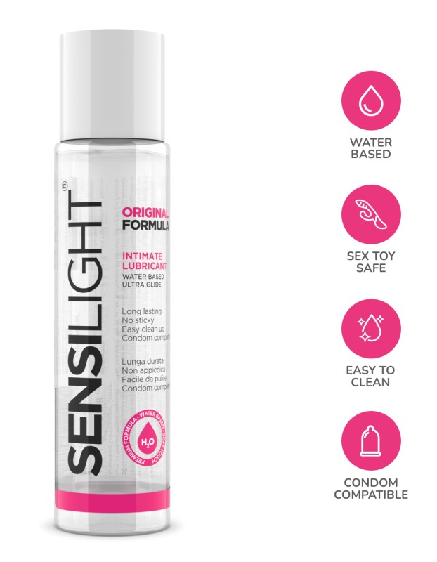 Sensilight Original Formula je lubrikant na bazi vode, sa efektom podmazivanja i hidratacije. Namenjen za upotrebu u intimnim delovima tela, formulisan je da olakša seksualni odnos u slučaju nedovoljnog prirodnog podmazivanja. Ovaj proizvod se lako ispira, ne ostavlja mrlje niti masne naslage i kompatibilan je sa upotrebom kondoma. Lubrikant garantuje dugotrajan i udoban efekat podmazivanja. Takođe se može primeniti na sve seks igračke. Nežna formula Sensilight Original Formule klizi po koži kako bi se sprečila bilo kakva nelagodnost ili peckanje. Njegova posebna formula čini ga savršenim za vaginalni seks, jer ima maksimalnu kompatibilnost sa sluzokožom.
