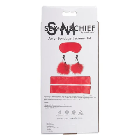 Ništa ne govori „Hoćeš li biti moj/moja?“ kao Amor Bondaž komplet za početnike. Preuzmite kontrolu nad scenom pomoću glatkih satenskih vezica i satenskog poveza za oči. I sigurno ćete zagolicati maštu svog partnera uz mekane stezaljke za golicanje i mekane stezaljke za bradavice.