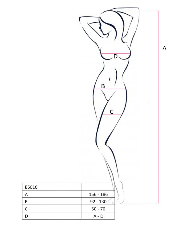 Ovaj seksi bodystocking savršeno prati linuju tela, naglašavajući ženstvene obline. Poseduje prorez između nogu. Ovaj bodystocking dostupan je u jednoj univerzalnoj veličini i neodoljiva su kombinacija prefinjenosti i zavodljivosti,. Izrađen je od visokokvalitetnih materijala – 80% poliamid i 20% elastina, obezbeđujući udobnost i rastegljivost koja omogućava da se savršeno prilagodi vašem telu. Univerzalna veličina S-L garantuje da će se savršeno pristajati na svaku figuru.