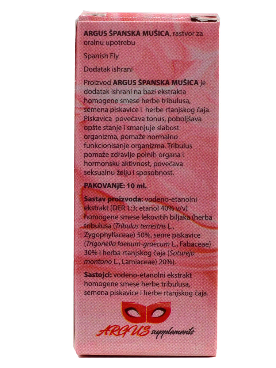 Ako želite da probate nešto novo i da pospešite Vaš seksualni odnos probajte ovaj naš novi proizvod na prirodnoj bazi sa akcentom na probranim potpuno prirodnim sastojcima.Španska mušica je dodatak ishrani na bazi ekstrakta homogene smese herbe tribulusa,semena piskavice i herbe rtnjaskog čaja.piskavica povećava tonus,poboljšava opšte stanje i smanjuje slabost organizma.Tribulus pomaže zdravlje polnih organa i hormonsku aktivnost,povećava seksualnu želju i sposobnost.