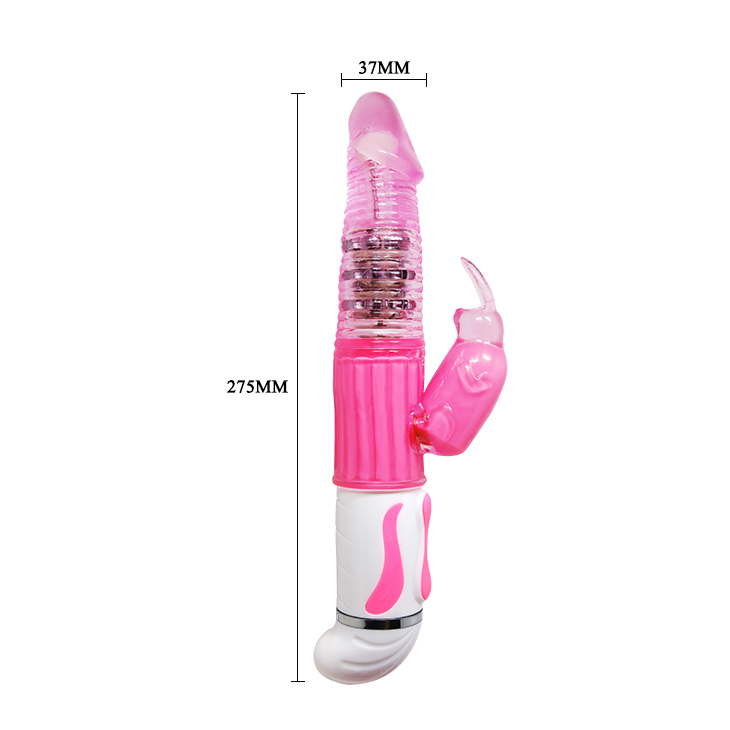 Silikonski vibrator sa 12 funkcija vibracije i 4 funkcije rotacije.Ovaj lepi roze silikonski vibrator ima dodatak za klitoralnu stimulaciju u obliku zeke.Napravljen je od silikona, ima perlice koje pojačavaju intenzitet masaže vagine prilikom rotacije. Koristi 4AAA baterije. Dužina:28cm. Prečnik:3,8cm.